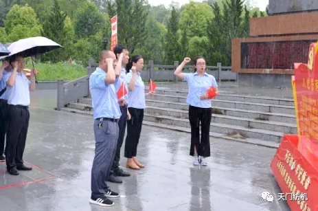 上午11點,風(fēng)雨交加,全體黨員頂風(fēng)冒雨,整裝列隊,向湘鄂西蘇區(qū)瞿家灣革命烈士紀念碑鞠躬默哀。新老黨員齊舉右手,面向黨旗莊嚴宣誓:“我志愿加入中國共產(chǎn)黨……”錚錚誓言彰顯了永恒初心。